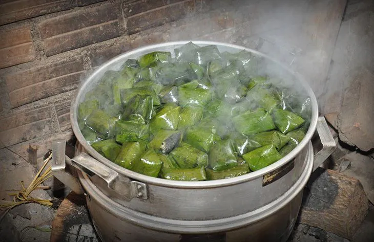 Để cho bánh khỏi dính, người ta chấm một chút dầu phộng, xoa đều trên tấm lá chuối xanh, sau đó bọc bánh lại theo hình tháp rồi mang đi hấp. Có nơi, người ta hấp bánh trần, bánh chín mới gói để giữ màu xanh của lá chuối. Khi ăn chỉ cần bóc nhẹ lớp lá chuối xanh là hiện ra lớp da bánh ít màu đen bóng, đầy vẻ quyến rũ, huyền bí.